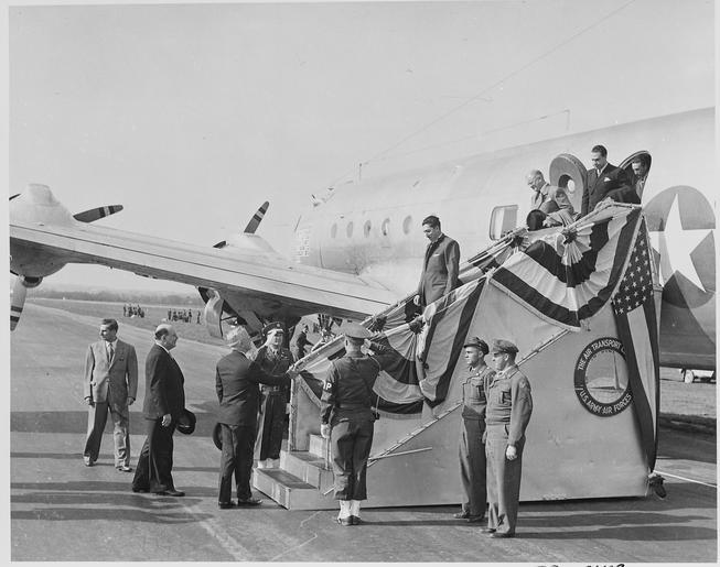 | Keywords: Photograph of President Miguel Aleman of Mexico walking down the steps from his airplane shortly after his arrival at... - NARA - 199573.tif Scope and content General notes 199573 Local identifier National Archives and Records Administration Office of Presidential Libraries Harry S Truman Library 04/01/1985 - NARA-Author Rowe Abbie 1905-1967 Photographer 8451352 <br /> Harry S Truman Library NLHST 500 West U S Highway 24 Independence MO 64050-1798 1947-04-29 Record group Collection HST-AVC Audiovisual Collection 1957 - 2006 Record group ARC 1207 Photographs Relating to the Administration Family and Personal Life of Harry S Truman compiled 1957 - 2004 documenting the period 1849 - 2004 Series ARC 198606 File unit File unit ARC Variant control numbers NAIL Control Number NLT-AVC-PHT-73 2418 yes Other versions <gallery> File Photograph_of_President_Miguel_Aleman_of_Mexico_walking_down_the_steps_from_his_airplane_shortly_after_his_arrival_at _-_NARA_-_199573 tif tif File Photograph_of_President_Miguel_Aleman_of_Mexico_walking_down_the_steps_from_his_airplane_shortly_after_his_arrival_at _-_NARA_-_199573 jpg jpg </gallery> NARA-cooperation PD-USGov Photographs by Abbie Rowe Black and white photographs NARA TIF images with categorized JPGs |
