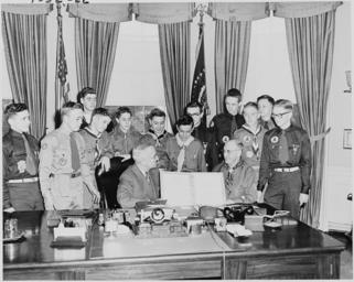 | Keywords: Photograph of President Truman in the Oval Office, receiving a report on the accomplishments of the Boy Scouts from a... - NARA - 200268.tif Scope and content General notes 200268 Local identifier National Archives and Records Administration Office of Presidential Libraries Harry S Truman Library 04/01/1985 - Creator Abbie Rowe Harry S Truman Library NLHST 500 West U S Highway 24 Independence MO 64050-1798 1951-02-06 Record group Collection HST-AVC Audiovisual Collection 1957 - 2006 Record group ARC 1207 Photographs Relating to the Administration Family and Personal Life of Harry S Truman compiled 1957 - 2004 documenting the period 1849 - 2004 Series ARC 198606 File unit File unit ARC Variant control numbers NAIL Control Number NLT-AVC-PHT- 73 3501 yes Other versions <gallery> File Photograph_of_President_Truman_in_the_Oval_Office _receiving_a_report_on_the_accomplishments_of_the_Boy_Scouts_from_a _-_NARA_-_200268 tif tif File Photograph_of_President_Truman_in_the_Oval_Office _receiving_a_report_on_the_accomplishments_of_the_Boy_Scouts_from_a _-_NARA_-_200268 jpg jpg </gallery> NARA-cooperation PD-USGov NARA TIF images with categorized JPGs Black and white photographs February 1951 in the United States Harry S Truman in 1951 White House in 1951 Boy Scouts of America Children in the Oval Office People with Curtains Harry S Truman in the Oval Office Photographs by Abbie Rowe Scouting in Washington D C Black and white photographs of people Photographs taken on 1951-02-06 |