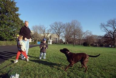 View Original:Photograph_of_President_William_Jefferson_Clinton,_Tyler_Clinton,_and_Zach_Rodham_Playing_with_Buddy_the_Dog_at_the_White_House:_12/25/1999.jpg (3150x2113)