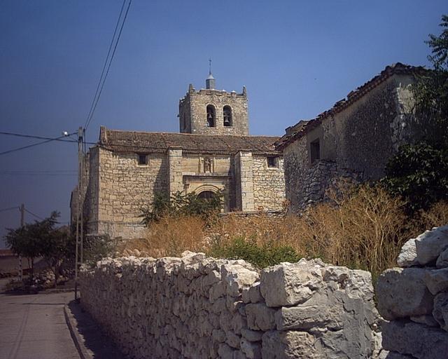 Keywords: PHTO0039.JPG Fuentes de Cuéllar en primer plano a la derecha la casa parroquial al fondo la iglesia de San Juan Bautista 2007-02-15 own assumed Isomax Church of San Juan Bautista Fuentes de Cuéllar