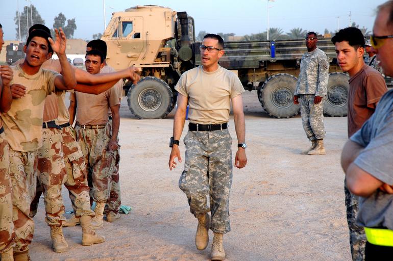 | Keywords: Physical Therapists Teach Iraqi Soldiers Physical Fitness DVIDS51906.jpg en Sgt Omar Aponte center a native of Bayamon Puerto Rico a physical therapy technician in Company C 210th Brigade Support Battalion 2nd Brigade Combat Team 10th Mountain Division Light Infantry out of Fort Drum N Y inspects Iraqi soldiers' form as they pass a sandbag for upper body strengthening at the Iraqi army compound in Mahmudiyah Iraq U S Army photo by 2nd Lt Liz Lopez <br>Unit Multi-National Division-Central 2007-08-01 https //www dvidshub net/image/51906/physical-therapists-teach-iraqi-soldiers-physical-fitness 51906 2007-08-02 06 06 MAHMUDIYAH IQ PD-USGov Fort Drum Images from DoD uploaded by Fæ |