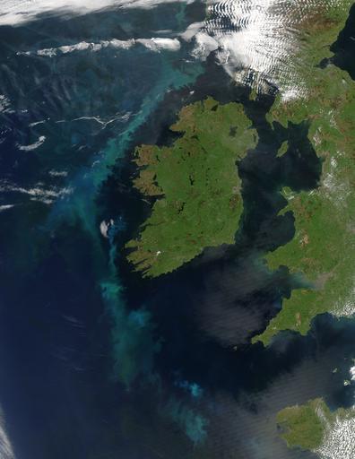 Keywords: Phytoplankton Bloom off Ireland, Image of the Day DVIDS834426.jpg en Swirling clouds of blue and green lit the Atlantic Ocean west of Ireland on June 2 2006 when the Moderate Resolution Imaging Spectroradiometer modis gsfc nasa gov MODIS on NASA's aqua nasa gov/ Aqua satellite captured this image The ocean is normally black in true-color photo-like satellite images such as this one but a large phytoplankton bloom lent the water its brilliant blue and green hues Phytoplankton are microscopic plants that grow in the sunlit surface waters of the ocean When enough of the plants grow in one place the bloom can be seen from space Aside from coloring ocean waters phytoplankton play a large role in sustaining ocean ecosystems and in global climate The tiny plants are the base of the marine food chain and places where blooms are frequent tend to support a thriving marine population Since the plants need nutrients like iron to grow fertile waters are often near a continental shelf in areas where cool water from the ocean's depths pushes to the surface This upwelling water carries with it nutrients that had settled to the ocean floor; the nutrients allow the water to sustain large phytoplankton blooms Phytoplankton influence global climate by regulating gases in the atmosphere Like all plants phytoplankton absorb carbon dioxide and release oxygen as they grow When the plants die they sink to the ocean floor carrying the absorbed carbon with them Over the course of the Earth's history the oceans have become the primary sink for atmospheric carbon dioxide Since carbon dioxide is a greenhouse gas it traps heat at the Earth's surface the Earth would be a much warmer place without phytoplankton In recognition of the importance of Earth's oceans President Bush declared June 4-10 2006 www whitehouse gov/news/releases/2006/06/20060602-6 html National Oceans Week In his proclamation the President said I call upon the people of the United States to learn more about the vital role the oceans play in the life of our country and how we can conserve their many natural treasures I encourage all our citizens to observe this week with appropriate programs and activities The large image provided above has a resolution of 250 meters per pixel The image is available in rapidfire sci gsfc nasa gov/gallery/ 2006153-0602/Ireland A2006153 1305 additional resolutions from the MODIS Rapid Response Team earthobservatory nasa gov/Library/Phytoplankton/phytoplankton1 html What are Phytoplankton NASA Identifier Ireland_AMO_2006153 2011-07-06 Glenn Research Center https //www dvidshub net/image/834426 834426 2013-02-08 03 44 WASHINGTON D C US PD-USGov Images from DoD uploaded by Fæ Ireland island Atlantic Ocean Phytoplankton |