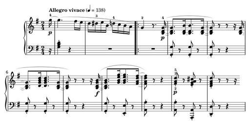 Keywords: Piano-sonata-16-Beethoven-introduction.svg Introduction of Beethoven's piano sonata No 16 File generated from the SVG output of Lilypond with the following file <pre> \header title Piano sonata No 16 in G major Op 31 No 1 subtitle Introduction source IMSLP03169 Boston Oliver Ditson Co 1876 U S edition of J G Cotta's edition Stuttgart composer Ludwig van Beethoven 1770-1827 copyright Public Domain \version 2 12 \paper set-paper-size a4 \score \new PianoStaff << \new Staff up \relative \clef treble \key g \major \time 2/4 \tempo Allegro vivace 4 138 \partial 16 g16-4\p 1 g4 fis16 e 2 d dis-3 e b d-4 c b a \bar 3 g4-2 r8 \slurUp <b d g>16-4\p ~ 4 <b d g>8 <b d b'>16 ~ <b d b'>8 <b d g>16 ~ 5 <b d g>8 r8 r8 r16 <b d g> ~ 6 <b d g>8 <d g b d>16 ~ <d g b d>8 <b d g>16 ~ 7 <b d g>8 r r r16 <b d g b>16\f ~ 8 <b d g b>8 <g' b e g>16 ~ <g b e g>8 <fis a d fis>16 ~ 9 <fis a d fis>8 r r4 10 <fis-2 a-3 d-5>8\staccato\p r <e g a cis>\staccato r 11 <d fis a d>\staccato r r r16 12 \new Staff down \relative \clef bass \key g \major \time 2/4 r16 1 <g b d>4\staccato r4 2 R2 3 R 4 <g g'>8\staccato r <g g'>\staccato r 5 <g g'>8\staccato r r4 6 <g g'>8\staccato r <g g'>\staccato r 7 <g g'>\staccato r r4 8 <g g'>8\staccato r <e e'>\staccato r 9 <a a'>\staccato r r4 10 <a a'>8\staccato r <a a'>\staccato r 11 <d d'>\staccato r r4 12 >> </pre> Rework with Inkscape removed text and converted all objects to paths then saved as simple SVG en Introduction of Beethoven's piano sonata No 16 fr Introduction de la sonate pour piano n° 16 de Beethoven own Romainbehar 2009-10-11 GNU LilyPond images Piano sonatas by Ludwig van Beethoven |