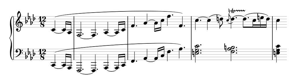 Keywords: Piano-sonata-23-Beethoven-introduction.svg Introduction of Beethoven's piano sonata No 23 File generated from the SVG output of Lilypond with the following file <pre> \header title Appassionata subtitle Allegro assai introduction source IMSLP00023 Heinrich Schenker Vienna Universal Edition 1918-1921 composer Ludwig van Beethoven 1797-1828 copyright Public Domain \version 2 10 \score \new PianoStaff << \new Staff \clef treble \key aes \major \time 12/8 \partial 8 3 c'4 ~ c'16 aes16 f2 ~ f4 aes4 ~ aes16 c'16 f'4 aes'4 ~ aes'16 c16 f4 f'4 c4 ~ c4 d8 \appoggiatura c8 \markup \natural d4 \startTrillSpan ~ d8 \stopTrillSpan \set stemLeftBeamCount 1 \set stemRightBeamCount 2 c16 \set stemLeftBeamCount 2 e16 d16 c4 \new Staff \clef bass \key aes \major \time 12/8 \partial 8 3 c 4 ~ c 16 aes 16 f 2 ~ f 4 aes 4 ~ aes 16 c 16 f 4 aes 4 ~ aes 16 c16 f4 aes4 <e g c'>2 <f aes b>2 <e g c'>4 >> </pre> Lilypond's SVG output was reworked with Inkscape removed text and converted all objects to paths then saved as simple SVG en Introduction of Beethoven's piano sonata No 23 fr Introduction de la sonate pour piano n° 23 de Beethoven Own Romainbehar 2008-08-23 GNU LilyPond images Piano sonatas by Ludwig van Beethoven |