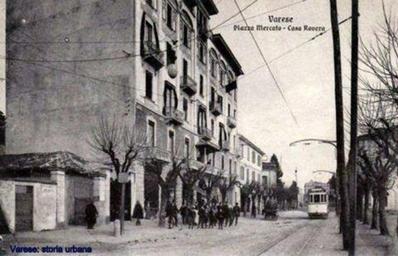 Keywords: varese tram caserma garibaldi casermagaribaldi outdoor road Vista di piazza Mercato (ora Repubblica), in primo piano a sinistra casa rovera. A destra la caserma Garibaldi. Vista di piazza Mercato (ora Repubblica), in primo piano a sinistra casa rovera. A destra la caserma Garibaldi.