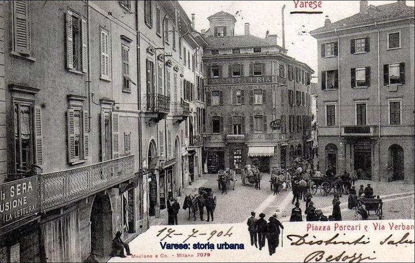 Keywords: varese piazza porcari piazzaporcari via verbano viaverbano via walter marcobi viawaltermarcobi piazza monte grappa piazzamontegrappa road architecture building outdoor Sulla sinistra la casa con i due balconi e i due alti archi al piano terra è casa Carantani già casa Porcari (rimodernata nel 1809 dall'arch. Lorenzo Zuccotti). L'edificio con torretta che ospita la cappelleria e reca l'insegna pubblicitaria dell'hotel Europa di via Sacco verrà demolito nel 1928 per fare spazio a palazzo Verga (ing. Mario Cantù). Tra questo palazzo e casa Cova (all'estrema destra, sostituito dal palazzo R.A.S., ing. Mario Loreti, 1935) è la strettissima via Verbano (ora Marcobi). Sulla sinistra la casa con i due balconi e i due alti archi al piano terra è casa Carantani già casa Porcari (rimodernata nel 1809 dall'arch. Lorenzo Zuccotti). L'edificio con torretta che ospita la cappelleria e reca l'insegna pubblicitaria dell'hotel Europa di via Sacco verrà demolito nel 1928 per fare spazio a palazzo Verga (ing. Mario Cantù). Tra questo palazzo e casa Cova (all'estrema destra, sostituito dal palazzo R.A.S., ing. Mario Loreti, 1935) è la strettissima via Verbano (ora Marcobi). |