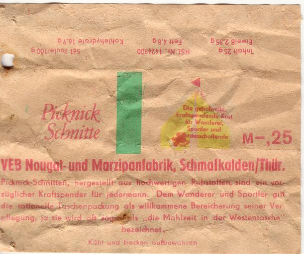 Keywords: Picknick Schnitte Schmalkalden.jpg Schmalkalden VEB Nougat- und Marzipanfabrik Verpackung einer Picknick-Schnitte Die gehaltvolle kraftspendende Kost für Wanderer Sportler und Geistesschaffende Dem Wanderer und Sportler gilt die rationelle Taschenpackung als willkommene Bereicherung seiner Verpflegung ja sie wird oft sogar als 'die Mahlzeit in der Westentasche' bezeichnet Preis M - 25 Scan einer DDR-Picknick-Schnitten-Verpackung Klaaschwotzer 2014-12-14 Cc-zero de Schmalkalden Companies and brands of the German Democratic Republic Viba sweets GmbH |