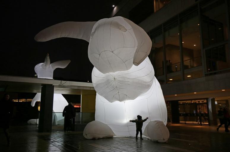 Keywords: hug rabbit public art publicart London, UK Large inflatable rabbit sculptures form part of the Southbank Centreâs Winter Festival. The seven metre high inflatable sculptures by Australian artist Amanda Parer entitled Intrude will be on display until January 11, 20 London, UK Large inflatable rabbit sculptures form part of the Southbank Centreâs Winter Festival. The seven metre high inflatable sculptures by Australian artist Amanda Parer entitled Intrude will be on display until January 11, 20 |