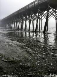 Keywords: pier ocean sea water black white dock beach seaside foggy spooky