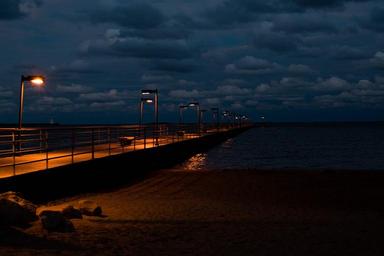 Keywords: pier ocean sunset landscape sea coast dusk twilight evening silhouettes shadows clouds reflection seascape scenic illuminated water lights wood beach sand
