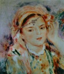 | Keywords: Pierre-Auguste Renoir - Femme algérienne.jpg Artwork 1883 Oil on canvas cm 40 32 Private collection accession number object history credit line top left A Renoir 83 Renoir peintre du bonheur 1841-1919 de Gilles Néret Köln Taschen 2001 p 150 ISBN 978-3-8228-5741-0 PD-old-auto 1919 Paintings of women by Pierre-Auguste Renoir Temporary for Cat-a-lot - Female humans Female brown eyes Female necklines in art Kerchiefs in art Colorful background Females with neutral background Female faces Females in art in three-quarter views Women facing left in art 19th-century portraits of women at bust length Portrait paintings of women of Algeria Orientalist paintings in France Traditional dresses Algeria in the 1880s 1883 paintings Paintings by Pierre-Auguste Renoir in private collections Taken with Panasonic Lumix DMC-TZ2 Algeria in the art of Pierre-Auguste Renoir |