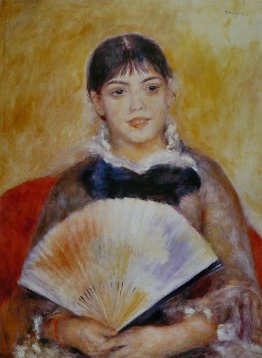 | Keywords: Pierre-Auguste Renoir - Femme à l'éventail.jpg ca 1881 Oil on canvas cm 65 50 Institution Hermitage Museum accession number object history credit line top right Renoir Renoir peintre du bonheur 1841-1919 de Gilles Néret Köln Taschen 2001 p 157 ISBN 9783822857410 PD-old-auto 1919 Taken with Panasonic Lumix DMC-TZ2 Femme à l'éventail by Pierre-Auguste Renoir |