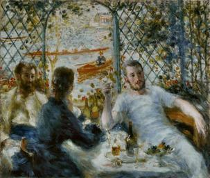 Keywords: Pierre-Auguste Renoir - Le Déjeuner au bord de la rivière.jpg ca 1879 Oil on canvas cm 55 1 65 9 Institution Art Institute of Chicago accession number Potter Palmer Collection 1922 437 object history credit line bottom left Renoir Renoir peintre du bonheur 1841-1919 de Gilles Néret Köln Taschen 2001 p 130 ISBN 9783822857410 PD-old-auto 1919 Maison Fournaise Lunch Restaurants in art Dining rooms in art 1870s paintings Potter Palmer Collection Paintings by Pierre-Auguste Renoir in the United States Taken with Panasonic Lumix DMC-TZ2 Paintings of men sitting at tables outdoors |