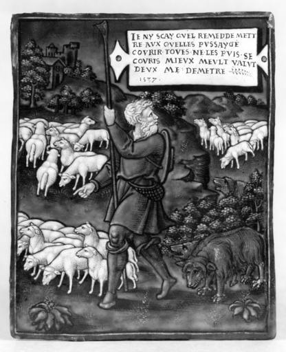 Keywords: Pierre Reymond - Plaque with the Bad Shepherd - Walters 44473.jpg An elderly shepherd glances apprehensively over his shoulder as two ragged and hungry wolves slink at his heels while a third howls in the bushes behind The inscription on the tablet describes how the old man unable to protect all of his sheep threatens to abandon them all The work represents the early style of the artist in which the composition was painted in grisaille and then covered with colored translucent enamels 1537 technique painted enamel copper cm 13 02 accession number 44 473 29329 Seligmann Rey Co New York date and mode of acquisition unknown Henry Walters Baltimore February 15 1912 by purchase Walters Art Museum Henry Walters Acquired by Henry Walters 1912 Russian Enamels The Walters Art Gallery Baltimore 1996-1997 place of origin Limoges France Walters Art Museum license 2D Limoges painted enamels in the Walters Art Museum Pierre Reymond Media contributed by the Walters Art Museum needs category review Painted enamel art in the Walters Art Museum |