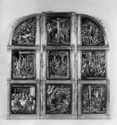Keywords: Pierre Veyrier II - Triptych with Scenes of the Passion of Christ - Walters 44364.jpg These nine plaques depict the Passion of Christ Beginning in the lower left a The Last Supper; b The Agony in the Garden; c Ecce Homo; d The Scourging of Christ at the Column; e The Mocking of Christ; f The Way to Cavalry; g Christ Fastened to the Cross; h The Crucifixion; i The Resurrection All are copied from engravings after Albrecht Dürer's woodcuts of the 'Little Passion' 1511 or after their copies by Marcantonio Raimondi B XIV pp 401-4 respectively nos 592 594 603 601 602 605 607 608 613 The order of c d and e has been interchanged The composition of d reverses that of the model ca 1528 1558 technique painted enamel copper Overall cm 63 59 5 accession number 44 364 14739 Dmitri Schevitch Madrid date and mode of acquisition unknown Sale Paris April 4-7 1906 lot 225 Arnold Seligmann Rey Co New York date and mode of acquisition unknown Henry Walters city Baltimore Walters Art Museum Henry Walters Acquired by Henry Walters 1919 place of origin Limoges France Walters Art Museum license Limoges painted enamels in the Walters Art Museum Pierre II Veyrier Media contributed by the Walters Art Museum needs category review Painted enamel art in the Walters Art Museum |