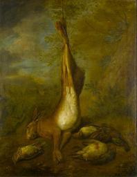 Keywords: Pieter Andreas Rijsbrack - A dead hanging hare with a dead grey partridge, a woodcock and a thrush.jpg Artwork creator Pieter Andreas Rijsbrack en A dead hanging hare with a dead grey partridge a woodcock and a thrush 1st half of 18th century http //www bonhams com/auctions/15832/lot/130 Oil canvas cm 91 6 71 2 Sold by Bonhams on 29 October 2008 in London as lot 130 signed with initials 'PA ' on rock lower centre the P and the A in ligature Other versions PD-old-100 Still life paintings by Pieter Andreas Rijsbrack |