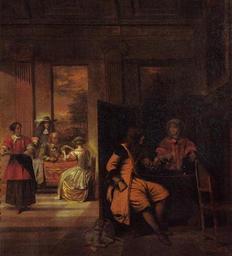 Keywords: Pieter de Hooch - A man and a serving woman behind a screen, with card players beyond.jpg Artwork creator Pieter de Hooch Title A man and a serving woman behind a screen with card players beyond in a neoclassical interior Gezelschap in een rijk interieur zich vermakend met kaartspel roken en drinken ca 1670 41794 ca 1660 oil canvas cm 88 81 unknown Private collection P C Sutton Pieter de Hooch Oxford 1980 cat no 119 ; C Hofstede de Groot Beschreibendes und Kritisches Verzeichnis der Werke der Hervorragendsten Hollandischen Maler des XVII Jahrhunderts vol I Paris 1907 cat no 266 object history credit line http //www sothebys com/en/auctions/ecatalogue/2001/old-master-paintings-part-i-l01121/lot 53 html Other versions http //www artnet com/artists/pieter-de-hooch/a-man-and-a-serving-woman-behind-a-screen-with-dAR4yorv_XbveEDVKlgGUw2 PD-old-100 Genre paintings by Pieter de Hooch 1660 paintings |