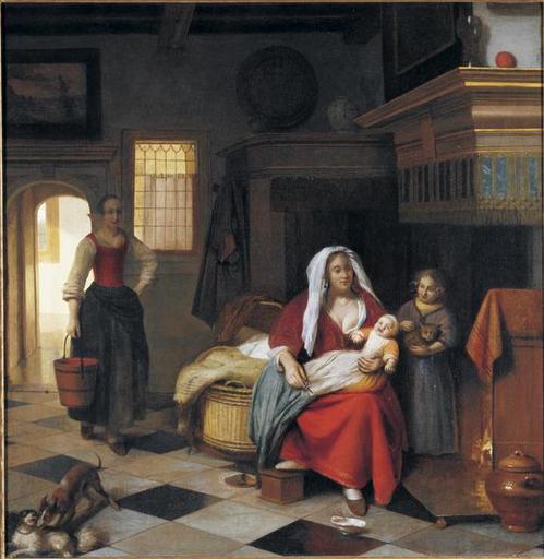 Keywords: Pieter de Hooch - A mother with two children and a maid in a kitchen with dogs and a cat by a fireplace.jpg Artwork creator Pieter de Hooch Title A mother with two children and a maid with a pail by a fireplace Huiselijke scene met een vrouw met kinderen bij de haard late jaren zeventig 61144 ca 1675 “1680 oil canvas cm 83 8 81 6 unknown Private collection P C Sutton Pieter de Hooch Oxford 1980 cat no 125 ; C Hofstede de Groot Beschreibendes und Kritisches Verzeichnis der Werke der Hervorragendsten Hollandischen Maler des XVII Jahrhunderts vol I Paris 1907 cat no 42 object history credit line http //www sothebys com/en/auctions/ecatalogue/2006/the-dealers-eye-n08163/lot 120 html Other versions PD-old-100 Genre paintings by Pieter de Hooch 1670s paintings Images from Sotheby's |