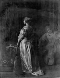 Keywords: Pieter de Hooch - Standing woman with a woman playing the cello.jpg Artwork creator Pieter de Hooch Title Standing woman with a woman playing the cello Staande vrouw en een vrouw die cello speelt fragment ca 1675 248192 ca 1675 oil canvas cm 67 52 unknown Private collection P C Sutton Pieter de Hooch Oxford 1980 cat no 115 ; C Hofstede de Groot Beschreibendes und Kritisches Verzeichnis der Werke der Hervorragendsten Hollandischen Maler des XVII Jahrhunderts vol I Paris 1907 cat no 127 object history credit line https //rkd nl/explore/images/248192 Other versions PD-old-100 Genre paintings by Pieter de Hooch 1675 paintings |