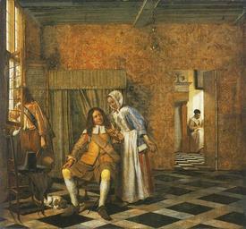 Keywords: Pieter de Hooch - Two men and a young woman in a distinguished interior.jpg Artwork creator Pieter de Hooch Title Two men and a young woman in a distinguished interior Twee mannen en een jonge vrouw in een voormaam interieur 247882 ca 1660-1664 oil canvas cm 60 66 Gm406 Institution Germanisches Nationalmuseum P C Sutton Pieter de Hooch Oxford 1980 cat no 55 ; C Hofstede de Groot Beschreibendes und Kritisches Verzeichnis der Werke der Hervorragendsten Hollandischen Maler des XVII Jahrhunderts vol I Paris 1907 cat no 5 possibly no 194 object history credit line http //www pubhist com/w4478 Other versions PD-old-100 Genre paintings by Pieter de Hooch 1660s paintings Paintings in the Germanisches Nationalmuseum |