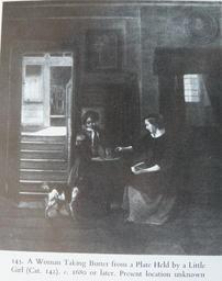 Keywords: Pieter de Hooch - A Woman Taking Butter from a Plate Held by a Little Girl.jpg Artwork creator Pieter de Hooch Title A Woman Taking Butter from a Plate Held by a Little Girl ca 1680 “1684 oil canvas cm 93 82 unknown Private collection P C Sutton Pieter de Hooch Oxford 1980 cat no 142 ; C Hofstede de Groot Beschreibendes und Kritisches Verzeichnis der Werke der Hervorragendsten Hollandischen Maler des XVII Jahrhunderts vol I Paris 1907 cat no 65 object history credit line Own Pieter de Hooch Complete Edition by Peter C Sutton Phaidon Press Oxford 1980 ISBN 0714818283 Other versions PD-old-100 Genre paintings by Pieter de Hooch 1680s paintings |