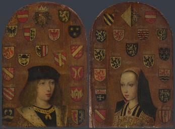 Keywords: Pieter van Coninxloo - Diptych.jpg Pieter van Coninxloo title Portrait of en King Philipp I the Handsome at the age of 16 and his sister Margarete 1480 - 1530 at the age of 14 who became Regent of the Netherlands Philip is wearing the collar of the Golden Fleece His arms are depicted at the top of this panel the other coats of arms are of territories which belonged to the House of Austria From the arms and inscriptions it can be established that this diptych was painted in about 1493-5 This is confirmed by a diptych of the same sitters at Schloss Ambras on the frame of which their ages are written as 16 and 14 so dating it to about 1494 The commission of the Schloss Ambras picture and the present painting was perhaps connected with a proposed double marriage into the Spanish royal house Diptychon ~ 1494 Institution National Gallery London 2 http //www nationalgallery org uk/paintings/probably-by-pieter-van-coninxloo-diptych-philip-the-handsome-and-margaret-of-austria National Gallery <br>1 http //luxfon com/painting/14798-piter-van-coninxloo-diptych-pieter-van-coninxloo-diptih-londonskaja-nacionalnaja-galereja html luxfon com PD-old-100-1923 DEFAULTSORT Coninxloo Philip I of Castile-Margaret of Austria 00 Pieter van Coninxloo Portrait diptychs Philip I of Castile in portrait paintings Early Netherlandish paintings in the National Gallery 15th-century portrait paintings in the National Gallery London 1494 paintings Uploaded with UploadWizard |