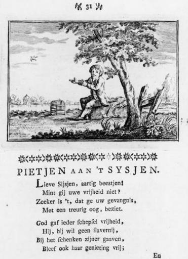 | Keywords: Pietjen and his Pet Bird 1785.png en Page of a textbook showing a boy releasing his pet bird with a poem that ends God gave every creature freedom / He rejects all slavery /His example I shall follow / Choosing now to set you free 1785 cite book Baggerman Arianne Dekker Rudolf Michel Child of the Enlightenment Revolutionary Europe Reflected in a Boyhood Diary http //books google com/books id TyfVlEk06EgC pg PA141 2009-01-01 BRILL 90-04-17269-6 141 Maatschappij tot Nut van 't Algemeen other versions PD-old-100-1923 Uploaded with UploadWizard Maatschappij tot Nut van 't Algemeen |