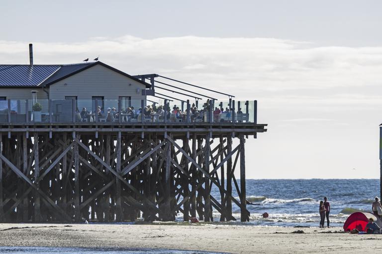 Keywords: pile construction beach st peter ording cafe restaurant nordfriesland coast north sea sea world natural heritage summer holiday recovery relax relaxation rest