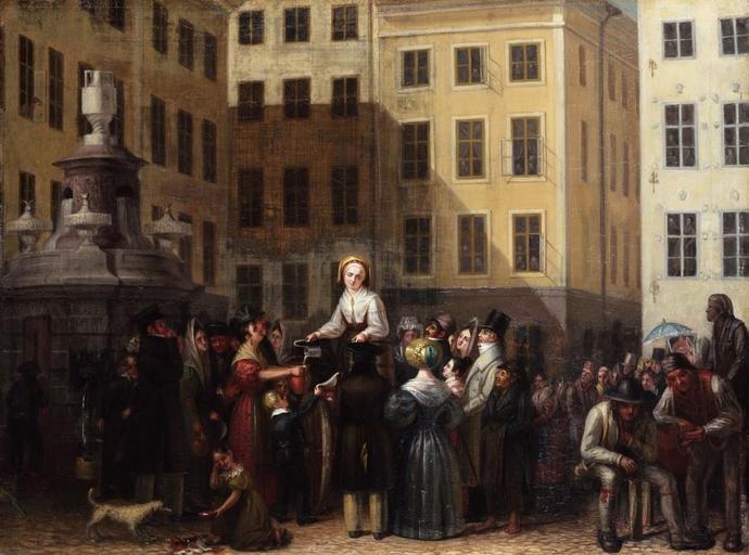 Keywords: Pilt Carin Stortorget.JPG sv Vackra Dalkullan Daniel Ols Carin Ersdotter säljer mjölk på Stortorget http //www stockholmskallan se/Soksida/Post/ nid 8837 Wahlbergson Erik 1833 1840 Stortorget Stockholm Stortorgsbrunnen Sweden in the 19th century PD-old |