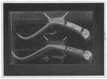 | Keywords: Pimpelspö m lejonhuvud - Livrustkammaren - 26696-negative.tif Brunmålat pimpelspö av snidat mörkt trä Handtaget svagt böjt med cirkelformat tvärsnitt och något avsmalnande mot mitten På ovansidan utsnidade och åt varsitt håll snedställda spetsar runt vilka fiskelinan - reven lindas Från mitten fortsätter spöet i en mjuk vinkel nedåt och avslutas med en kraftig böj uppåt Spetsen är täckt av en tunn silverplåt försedd med en rund ögla upptill i vilken reven löper Handtaget är klätt med grönt sammet där kanterna samt sömmen döljs av en ca 12 mm bred guldgalon avslutas bakåt av ett snidat och brunmålat lejonhuvud med öppet gap röd tunga och vågig man Runt om de snedställda spetsarna är en grönfärgad och tvinnad rev lindad I reven är fastsatt en ofärgad tafs något tunnare än reven i tafsens ände är fäst en 60 mm lång pilk av tenn eller bly ett fiskedrag med två krokar utan hullingar varav den ena kroken är något större original caption decade 1760 size mm 360 size mm 25 handtag size mm 42 huvud LRK Carl Gustaf Tessin Envoyé informator 1695-1770 Sverige Ture Bielke Nils Adam Bielke greve riksråd Jakten - konstnärens motiv - jägarens mål 2003 1700-tal CG Tessin på Läckö 2005 place of origin original filename LN_B07253_010133 67054 inventory number LRK 30509 26696 CC0 Pimpelspö m lejonhuvud - Livrustkammaren - 26696 tif <gallery caption Different images of same object > File Två pimpelspön med tillhörande krokar och låda - Livrustkammaren - 5397 tif File Pimpelspö m lejonhuvud - Livrustkammaren - 9572 tif </gallery> |