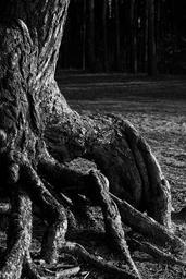 Keywords: pine trunk the roots of the trees nature the bark tree trunks bent tree distorted stock landscape photo black and white contrast light key nightmare horror movie view forest