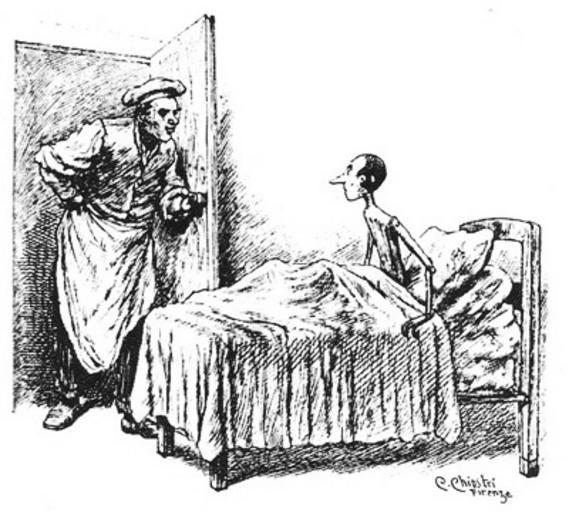Keywords: PinocchioChiostri6.jpg it Pinocchio viene svegliato dall'oste nell'osteria del Gambero Rosso Illustrazione di Carlo Chiostri 1863 - 1939 dal libro di Collodi Le avventure di Pinocchio 1901 scan of a book Collodi Le avventure di Pinocchio 1901 Carlo Chiostri 1863 - 1939 1901 Carlo Chiostri Le avventure di Pinocchio PD-old |
