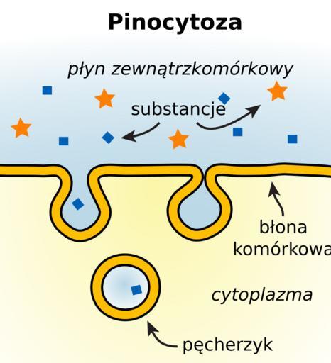 Keywords: Pinocytoza.svg Pinocytoza - sposób odżywiania się przez pobieranie drobin białek lub innych substancji rozpuszczalnych w wodzie Polega na tworzeniu pęcherzyków - wodniczek pokarmowych odrywajacych się od błony komórkowej i trawionych przy udziale lizosomów Pinocytosis is a form of endocytosis in which small particles are taken in by a cell by splitting into smaller particles The particles then form small vesicles which subsequently fuse with lysosomes to hydrolyze or to break down the particles modified Image Endocytosis types svg author Mariana Ruiz Villarreal LadyofHats 2007-09-13 Jacek FH <gallery> Image Pinocytosis svg English version - pinocytosis Image Endocytoza typy svg Typy endocytozy Image Fagocytoza svg Fagocytoza Image pinocitosi svg Italian version -Pinocitosi </gallery> Ultrastructure diagrams Endocytosis |