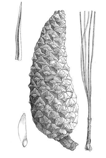 Keywords: Pinus gordoniana illustration.png of the species in Gordon G 1847 New Plants etc from the Society's Garden Journal of the Horticultural Society 2 77-80 1847 Specimen collected on the upper slopes of Cerro de San Juan near Tepic Nayarit Mexico; approx 21°27'N 104°58'W ~2000m altitude http //biodiversitylibrary org/page/43585288 G Gordon Journal of the Horticultural Society 2 80 1847 Karl Theodor Hartweg George Gordon 1847 Scan from original Authors died 1871 Hartweg and 1893 Gordon so out of copyright PD-old Pine cones drawings Pinus gordoniana |