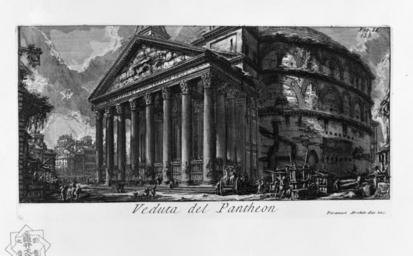 | Keywords: Piranesi-1022.jpg 1 1021 1023 XIV Veduta del Pantheon 53 9 x 41 4 cm it Pantheon o sia Tempio di Giove Ultore consistente in una magnifica Cella ed in un maestoso Pronao come si dimostra nella predetta Tav XIV alla figura II Egli fu fabbricato da M Agrippa come apparisce dalla seguente iscrizione scolpita sul fregio del medesimo Pronao notato nella detta figura colla lettera A M AGRIPPA L F COS TERTIVM FECIT Fu poscia ristorato dagli imperadori Settimio Severo e Caracalla come apparisce dalla consecutiva iscrizione che si legge nelle fasce dell ™Architrave del medesimo Pronao notato colla lettera B IMP CAESAR SEPTIMIVS SEVERVS PIVS PERTINAX ARABIC ADIABENIC PARTIIIC PONTIF MAX TRIB POT XI COS III P P PROCOS ET IMP CAES MARCVS AVRELIVS ANTONINVS PIVS FELIX AVG TRIB POT V COS PROCOS PANTHEVM VETVSTATE CORRVPTVM CVM OMNI CVLTV RESTITVERVNT Questo secondo la relazione degli antichi scrittori era un Tempio de ™ più splendidi ed è l ™unico monumento dell ™antica magnificenza che sia rimaso illeso nelle sue parti principali I di lui muri sono di una portentosa grossezza fabbricati di opera incerta e fermati ogni quattro palmi con un letto di tevoloni resi vieppiù stabili da un ™arcuata costruzione parimente di tevoloni dimostrata nella detta figura alla lett C ed investiti nell ™esterno di tevolozza triangolare Il Pronao poi ha sedici gravi colonne di granito orientale di smisurata grossezza Era anticamente coperto con travi e tegole di bronzo le quali furon tolte al tempo di Urbano VIII e fatte rifondere per formarne la Confessione de ™SS Apostoli Pietro e Paolo nella Basilica Vaticana sendo stato supplito in di loro vece con travi di legno e con tegole laterizie Nel timpano del di lui frontespizio segnato colla lettera D sono quantità di buchi ne ™quali s ™internavano de ™ perni impiombati per sostegno d ™un bassorilievo parimente di bronzo Cfr Pianta di Roma disegnata colla situazione di tutti i Monumenti antichi num 79 Exterior of Pantheon Rome in art 1756 Etchings by Giovanni Battista Piranesi |