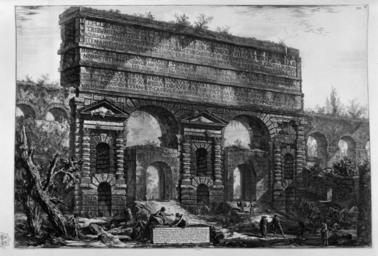 Keywords: Piranesi-16052.jpg 16 16051 16053 49 it Veduta del Monumento eretto dall' Imperador Tito Vespasiano per aver ristaurati gl' Aquedotti dell' Acqua dell' Anione nuove e Claudia essendovi scolpito in esso il nome di Claudio che lo edificò e di Vespasiano che lo restaurò Aquedotto di Sisto V che conduce l' Acqua felice Forami fatti per introdurvi l' Aquedotto sopradetto Porte di Aureliano o siano di Arcadio ed Onorio fabbricate sopra varie macerie che in quel tempo coprivano l' antico piano di Roma Via Labicana Via Prenestina 54 6 x 78 6 cm Porta Maggiore Rome in art |