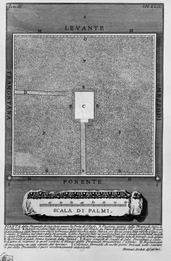 | Keywords: Piranesi-3-43.jpg 3 3-42 3-44 XLIII it PIANTA della Piramide di Cajo Cestio presso la Porta di S Paolo A Facciata antica della Piramide sopra la Via Ostiense B Ingresso moderno fatto scavare nel mezzo del Masso da Papa Alessandro VII quale scavo forse per inavvertenza degli Operaj non riuscí nel mezzo della Nicchia della Stanza ove dovea essere stato riposto il Vaso colle ceneri C Stanza nel centro della Piramide D Altro Ingresso fatto ne' secoli passati per il quale probabilm te sarà stato estrato il Vaso e quanto eravi nella Stanza rinchiuso poiche al tempo del predetto Pontefice non fu trovato cosa alcuna E Mattonato il quale forma le pareti della Stanza F Masso composto di Scaglie di Selci Pozzolana e Calce G Lastre di marmo le quali vestono il Masso della Piramide formandone l'esterno H Bassamento di travertino in oggi coperto dal terreno I Colonne formate di molti pezzi trovati nello scavare a pie della Piramide e quivi modernamente innalzate ru План пи амиды Цестия у во от св Павла A Д евний фасад пи амиды об ащенный к Остийской до оге B Сов еменный п оход п окопанный в яд е пи амиды п и естав ации Папы Александ а VII ведущий возможно по недосмот у аботников п ямо в се едину ниши комнаты где должна была азмещаться ваза с пеплом C Комната в цент е пи амиды D Д угой п оход сделанный в п ошлые века ве оятно с целью изъятия вазы и д угих п едметов запе тых в комнате поскольку во в емена вышеупомянутого Римского папы там уже ничего не было найдено E Ки пичный пол на кото ом стоят стены комнаты F Яд о пи амиды об азованное осколками к емней пуццолана и извести G Слои из м амо а кото ые пок ывают яд о пи амиды фо ми уя внешнюю ее пове хность H Цоколь из т аве тина ныне ск ытый под землей I Колонны составленные из многих ф агментов найденных в п и аскопках вок уг пи амиды и установленные на этом месте в новейшие в емена Aurelian Walls in art 1756 Pyramid of Caius Cestius Rome in art 1756 18th-century images of Rome Pyramid 1700s Plans of ancient Roman buildings in Rome Pyramid 1700s Engravings of cities Rome Etchings by Giovanni Battista Piranesi Le antichità Romane Piranesi Piranesi-3043 |