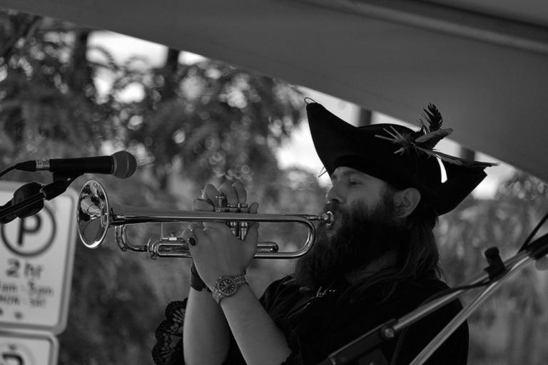 Keywords: blackandwhite black white bw monochrome street streetphotography downtown canada britishcolumbia bc okanagan kelowna pirate trumpet musician summer blockparty music man male guy person playing costume hat beard