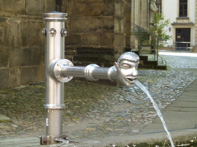 Keywords: pirna germany fountain water spigot pavement urban unique silver metallic close-up face man