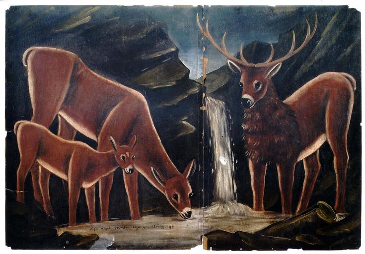| Keywords: Pirosmani. Three deers drinking water.jpg Artwork Creator Niko Pirosmani 1917 oil on cardboard cm 145 95 private collection Tbilisi accession number object history credit line http //3 bp blogspot com/_T21ZDE0tseA/Shh4bqL2Y8I/AAAAAAAAAkU/nL35FLYNSOw/s1600-h/p419 jpg 3 bp blogspot com Source of the second version http //diary-or-notes cocolog-nifty com/blog/files/Slide_Show_a zip diary-or-notes cocolog-nifty com Source of the first version http //www russianavantgard com/Artists/pirosmani/pirosmani_a_deer_family jpg www russianavantgard com Paintings by Niko Pirosmani Oil on cardboard 1917 paintings 1917 in Georgia Deer in art Source http //artgeorgia blogspot com/2009/05/pirosmani html artgeorgia blogspot com Source of the second version http //diary-or-notes cocolog-nifty com/blog/2009/01/post-e8fb html diary-or-notes cocolog-nifty com Source of the first version http //www russianavantgard com/Artists/pirosmani/pirosmani_a_deer_family html www russianavantgard com PD-old-auto 1918 |