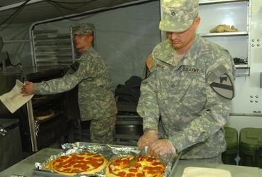 Keywords: Pizza Party Provided to Taji Troops DVIDS35095.jpg en Batavia N Y native Staff Sgt Jeffrey Lambert left and Pfc Michael Minch of Clark N J both food service specialists for Company E Echo 2nd Battalion 8th Cavalry Regiment prepare Little Caesars pizzas for the Soldiers of Company B Band dog 2nd Bn 8th Cav Regt in a mobile field kitchen emplaced at the Co B motorpool Jan 18 on Camp Taji Iraq 2007-01-18 Staff Sgt Jon Cupp https //www dvidshub net/image/35095 35095 2007-01-22 11 55 TAJI IQ PD-USGov Camp Taji Images from DoD uploaded by Fæ |