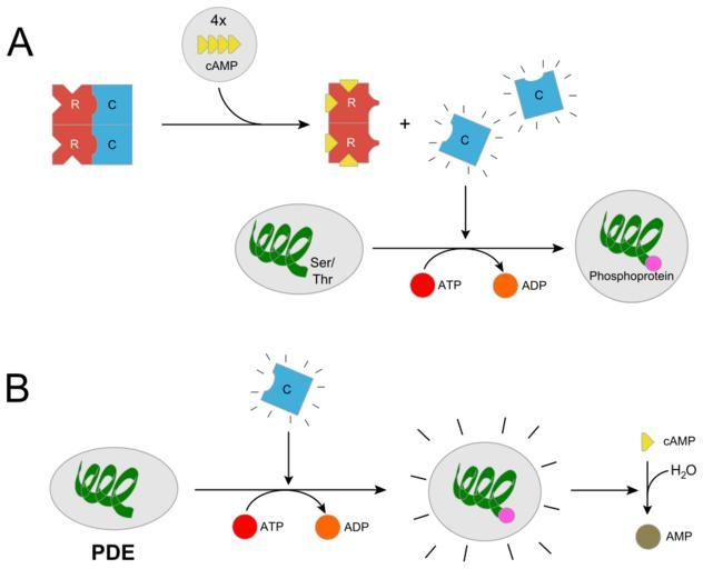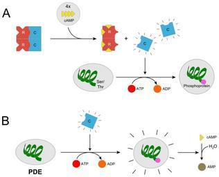 Keywords: PKARII.svg en A Activation of protein kinase A of higher eucaryotes via cAMP The freed C-subunits are phosphorylating various substrate proteins at specfic serine or threonine sites respectively Hereby ATP is converted to ADP B One of the substrates of PKA is the phosphodiesterase PDE After phosphorylation by PKA the activated enzyme catalyzes the hydrolysis of cAMP to AMP Hence the activity of PKA is reduced or terminated feedback control de A Aktivierung der Proteinkinase A höhere Eukaryoten Genereller Aktivierungsmechanismus durch cAMP Die freien C-Untereinheiten phosporylieren eine Reihe von Substraten an spezifischen Serin- bzw Threoninresten unter Verbrauch von ATP B Ein Substrat der PKA ist die Phosphodiesterase PDE Nach Phosphorylierung liegt diese in einem aktiven Zustand vor Infolgedessen katalysiert die PDE die Hydroylse von cAMP zu AMP so dass die Aktivität der PKA reduziert wird oder erlischt feedback control File Proteinkinase 1 svg de File PKARII png 12 40 2 December 2009 UTC Yikrazuul; chris 論 Protein kinase A |
