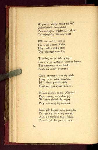 | Keywords: PL Tadeusz Boy-Żeleński-Słówka 030.jpg Słówka zbiór wierszy i piosenek by w Tadeusz Boy-Żeleński 1874-1941 a Polish writer and translator of French literature Słówka zbiór wierszy i piosenek autorstwa w Tadeusz Boy-Żeleński Tadeusza Boya-Żeleńskiego pl polskiego pisarza i tłumacza literatury francuskiej http //www polona pl/dlibra/docmetadata id 8263 Cyfrowa Biblioteka Narodowa Polona Creator Tadeusz Boy-Żeleński Słówka zbiór wierszy i piosenek Series title Księgarnia Polska B Połonieckiego; E Wende Drukarnia Narodowa w Krakowie 1913 Lviv - Warsaw pl PD-old Słówka Tadeusz Boy-Żeleński |