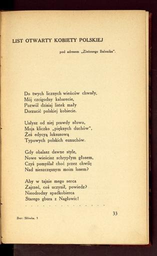 | Keywords: PL Tadeusz Boy-Żeleński-Słówka 041.jpg Słówka zbiór wierszy i piosenek by w Tadeusz Boy-Żeleński 1874-1941 a Polish writer and translator of French literature Słówka zbiór wierszy i piosenek autorstwa w Tadeusz Boy-Żeleński Tadeusza Boya-Żeleńskiego pl polskiego pisarza i tłumacza literatury francuskiej http //www polona pl/dlibra/docmetadata id 8263 Cyfrowa Biblioteka Narodowa Polona Creator Tadeusz Boy-Żeleński Słówka zbiór wierszy i piosenek Series title Księgarnia Polska B Połonieckiego; E Wende Drukarnia Narodowa w Krakowie 1913 Lviv - Warsaw pl PD-old Słówka Tadeusz Boy-Żeleński |
