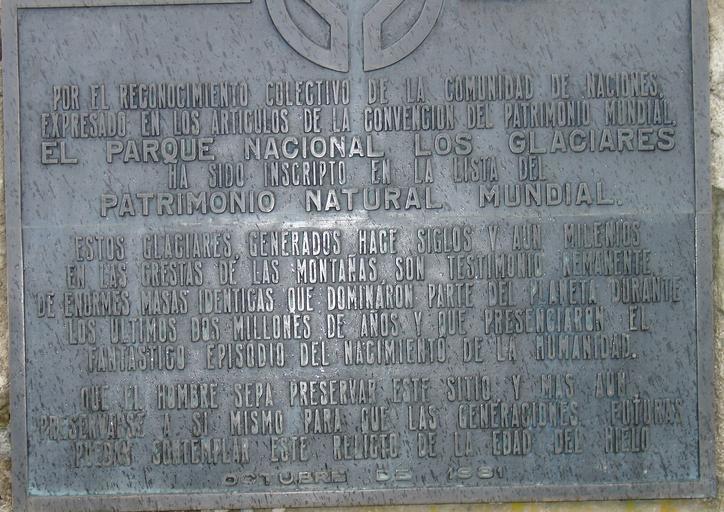 | Keywords: Placa Glaciares Patrimonio Natural Mundial.jpg Placa ubicada en las cercanías del Parque Nacional Los Glaciares Argentina Dice Por el reconocimiento colectivo de la Comunidad de Naciones expresado en los artículos de la convención del Patrimonio Mundial EL PARQUE NACIONAL LOS GLACIARES ha sido inscripto en la lista del PATRIMONIO NATURAL MUNDIAL Estos glaciares generados hace siglos y aún milenios en las crestas de las montañas son testimonio remanente de enormes masas idénticas que dominaron parte del planeta durante los últimos dos millones de años y que presenciaron el fantástico episodio del nacimiento de la humanidad Que el hombre sepa preservar este sitio y más aún preservarse a si mismo para que las generaciones futuras puedan contemplar este relicto de la edad del hielo Octubre de 1981 2006-09-18 own assumed Albasmalko Plaques in Argentina Los Glaciares National Park |