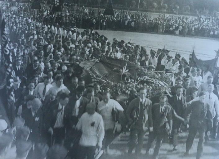 | Keywords: 20th century 20thcentury soviet union sovietunion boris souvarine borissouvarine russia commemoration demonstration petrograd saint-petersburg saintpetersburg field of mars fieldofmars february revolution februaryrevolution iind congress iindcongress third international thirdinternational communist international communistinternational comintern july 1920 july1920 iiird international iiirdinternational Boris Souvarine Papers - Soviet Russia Photos graduateinstitute.ch/home/research/library/archives/boris... Notes: The « Square of the Victims of the Revolution » designates the Field of Mars, in Saint-Petersburg/Petrograd. After the February Revolution in 1917, this area of the city became a memorial place, where participants killed during the Revolution were buried. This picture probably shows a commemoration, which took place at the opening of the IInd Congress of the IIIrd International (17th July 1920). On this occasion, the delegates of the International came in procession to the Field of Mars, to pay a tribute to the victims. The procession may be carrying a symbolical coffin. Unknown photographer. Description: 1 photograph. Black and white ; 10 x 14 cm. Sources and further reading: Rosmer, Alfred. 1920. Moscou sous Lénine. Extract available online, "XIII: Smolny - Séance solennelle d'ouverture du IIe Congrès": www.marxists.org/francais/rosmer/works/msl/msl2013.htm Boris Souvarine Papers - Soviet Russia Photos graduateinstitute.ch/home/research/library/archives/boris... Notes: The « Square of the Victims of the Revolution » designates the Field of Mars, in Saint-Petersburg/Petrograd. After the February Revolution in 1917, this area of the city became a memorial place, where participants killed during the Revolution were buried. This picture probably shows a commemoration, which took place at the opening of the IInd Congress of the IIIrd International (17th July 1920). On this occasion, the delegates of the International came in procession to the Field of Mars, to pay a tribute to the victims. The procession may be carrying a symbolical coffin. Unknown photographer. Description: 1 photograph. Black and white ; 10 x 14 cm. Sources and further reading: Rosmer, Alfred. 1920. Moscou sous Lénine. Extract available online, "XIII: Smolny - Séance solennelle d'ouverture du IIe Congrès": www.marxists.org/francais/rosmer/works/msl/msl2013.htm |