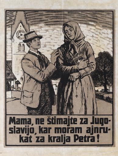 Keywords: Plakat ob plebiscitu Mama, ne štimajte za Jugoslavijo 1920.jpg sl Avstrijski propagandni plakat ob plebiscitu »Mama ne štimajte glasujte za Jugoslavijo kar moram ajnrukat v vojsko za kralja Petra « Nemška stran je poskušala s takimi sporočili ustvariti prepričanje da sta vojaštvo in krvoločnost značilnost jugoslovanstva/slovenstva v tem primeru zaradi splošne vojaške obveznosti avstrijstvo/nemštvo pa je bilo prikazano kot miroljubno Published by Gutenberghaus copy from Dr Franc Sušnik's central library of Carinthia Slovenia digitized by Digital Library of Slovenia 2S2TJ8AB author 1920 assessments 1 PD-Slovenia Carinthian Plebiscite Political posters of Slovenia |