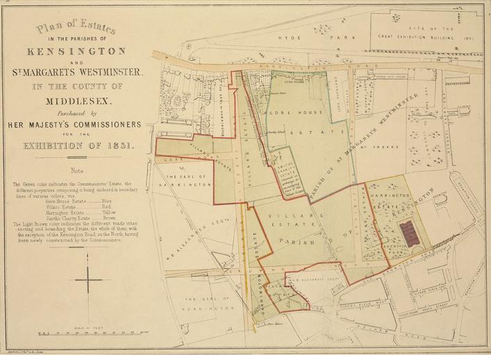 Keywords: Plan of Estates purchased by Her Majesty's Commissioners for the Exhibition of 1851.jpg Plan of Estates in the Parishes of Kensington and St Margaret's Westminster in the County of Middlesex Purchased by Her Majesty's Commissioners for the Exhibition of 1851 The site in South Kensington depicted in green on this plan was purchased by the Queen's Commissioners to host the Great Exhibition of 1851 The coloured boundaries have the following meanings Blue Gore House Red Villar Yellow Harrington Brown Smith's Charity Estate The site is now occupied mostly by the Natural History Museum the Science Museum Imperial College London and the Royal Albert Hall Media Chromolithograph 229×330mm Lithographer Day Son Scale 1 400 Feet 1 4800 Library number Maps Crace X 15 British Library Online Exhibit http //www bl uk/onlinegallery/onlineex/crace/p/007zzz000000010u00015000 html 1851 Presumably Her Majesty's Commissioners for the Exhibition pd-old Old maps of London The Great Exhibition |
