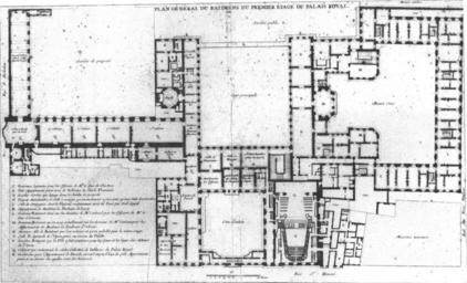 Keywords: Plan général du batimens du premier étage du Palais Royal c1760 - JH Johnson 1995 p12.jpg Category Palais-Royal in Architecture françoise 1754 Category Palais-Royal in Architecture françoise 1754 Palais-Royal in 1754 The portion of the palace shown in the upper right in the plan labelled with the letter M was designed by Pierre Contant d'Ivry and built in the early 1750s for Louis-Philippe the Fat Duke of Orléans The eastern part of the Basse Cour is now the Place de Valois and the east-facing avant corps on the west side of the Basse Cour and the adjacent portions of its wing are directly across from it on the west side of the rue de Valois see 2010 photo The plan also shows the former theatre of the Académie royale de Music the first Salle du Palais-Royal labelled with the letter O which is south of the wing with the avant corps and east of the Cour d'entrée later to become the Cour de l'Horlogue The theatre and nearby sections of the Palais-Royal were destroyed by fire on 6 April 1763 see an engraving of the fire and this resulted in the redesign and reconstruction of the principal sections of the palace Ayers Andrew 2004 The Architecture of Paris pp 47 “48 Stuttgart; London Edition Axel Menges ISBN 9783930698967 User scan of Johnson James H 1995 Listening in Paris A Cultural History p 12 Berkeley University of California Press ISBN 9780520206489 <br />The original is from Blondel Jacques-François 1754 Architecture françoise Tome 3 Livre V Chapitre XIX Planche 3 http //gallica bnf fr/ark /12148/bpt6k1080325/f83 image r langEN View at Gallica Creator Jacques-François Blondel 1754 publication <gallery> File Palais-Royal - Plan du premier étage - Architecture françoise Tome3 Livre5 Ch9 Pl3 jpg higher resolution </gallery> PD-old-100 Palais-Royal in Architecture françoise 1754 other versions Plate3 Première salle du Palais-Royal |