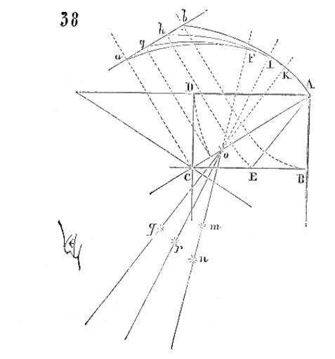Keywords: Plan.voute.XIVe.siecle.png ils prétendirent vers la même époque c'est-à-dire au commencement du XIV<sup>e</sup> siècle avoir avec des arcs formés de courbes composées des liernes sur un plan horizontal et non plus inclinées vers les formerets et arcs-doubleaux Voici fig 38 comment ils s'y prirent pour arriver à ce résultat Soit un quart de voûte d'arête ABCD un tierceron étant tracé en AE Pour les naissances de tous ces arcs c'est-à-dire du formeret AB du tierceron AE de l'arc ogive AC de l'arc-doubleau AD et de tous les autres arcs s'il plaît d'en tracer d'autres comme dans le précédent exemple un seul arc AF a été tracé le centre de cet arc étant en D Rabattant les longueurs de chacun de ces arcs sur la ligne AC considérée comme base et de ces points de rabattement élevant des perpendiculaires sur la base la ligne <i>ab</i> étant considérée comme le niveau auquel doit atteindre chacun de ces arcs on trace les segments F<i>a</i> F<i>g</i> en prenant leurs centres en <i>m</i> et <i>n</i> sur la ligne Fo<i></i> prolongée Dictionnaire raisonné de l'architecture française du XI<sup>e</sup> au XI<sup>e</sup> siècle ~ 1856 Eugène Viollet le Duc Viollet-le-Duc Vault Viollet-le-Duc